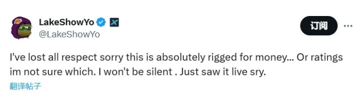 湖人媒体LakeShowYo更推怒喷裁判判罚:“这比赛已经完全失去我的尊重了,对不起,这完全是为了钱……或者收视率,我不确定,我不会保持沉默,不好意思我刚刚看现场直播了。”